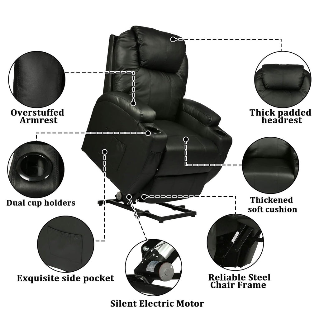 - This adjustable lift electric recliner chair comes with 4 areas of massage (shin, thigh, lumbar, head) and 5 modes (pulse, press, wave, auto, normal), meeting all your demands for different massages.