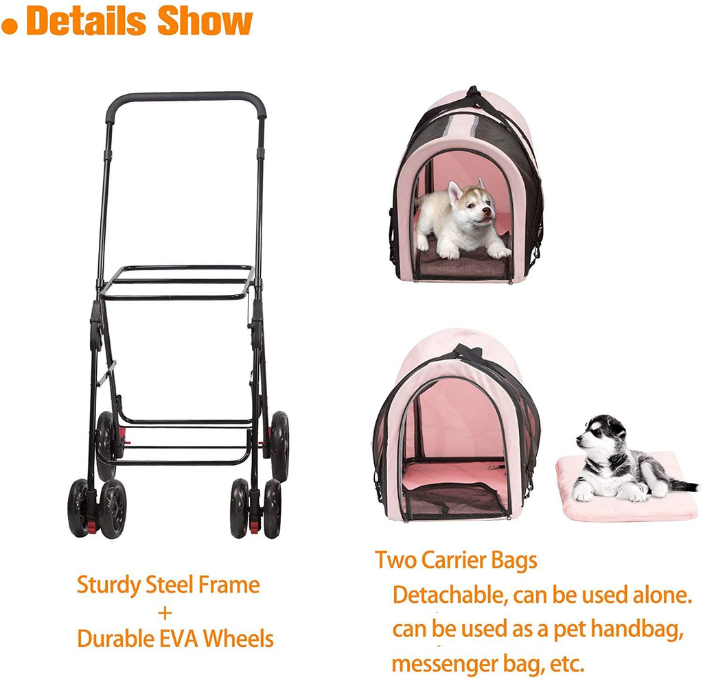 3-in-1 Multifunctional Design: The double-layer pet stroller is designed with 2 detachable pet carriers, which can be used as a pet stroller, carrier bag, car seat carrier, and even as a pet crate, and you can decide how to use it according to your different ways of going out, whether to the shop, mall, hospital, go for travel or stroll.