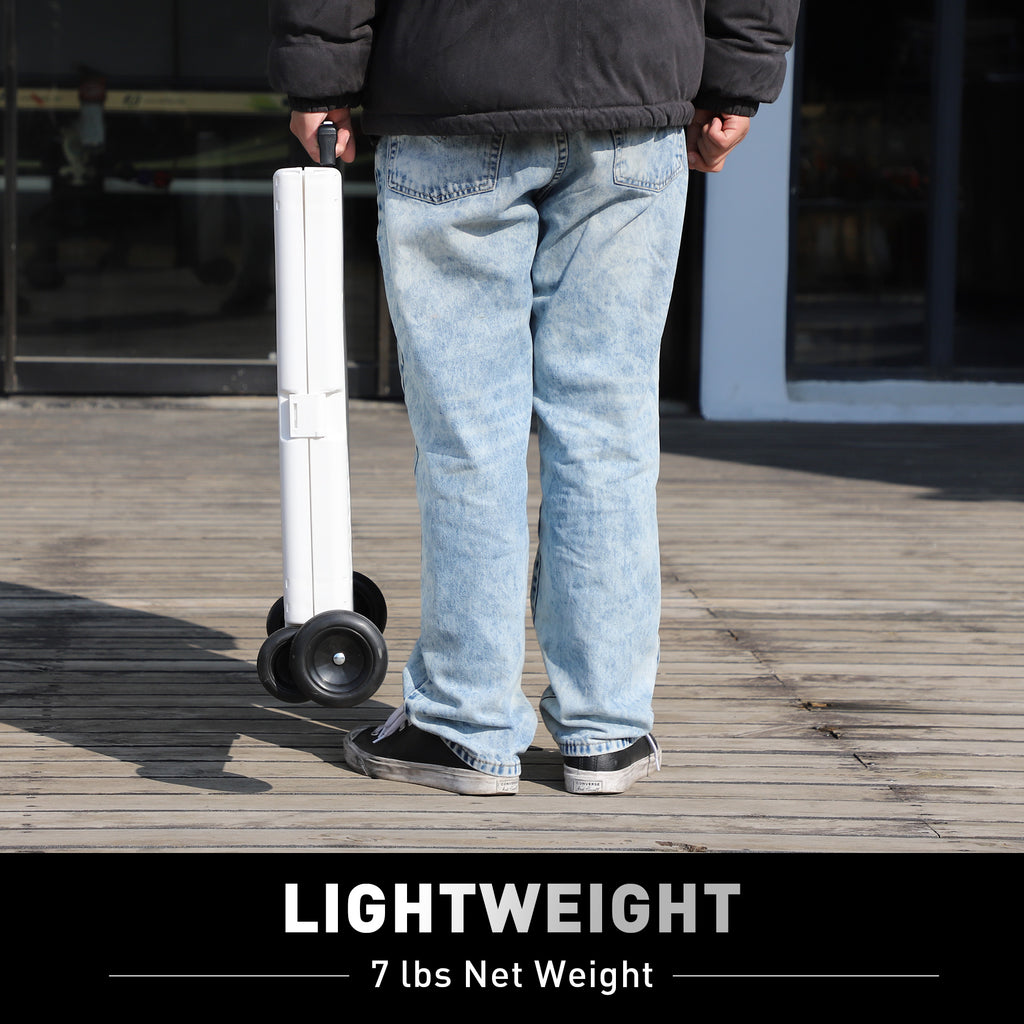 The weight of our collapsible shrink cart is only 7 lbs, made of PP+ABS+PVC material, light weight, and environmental protection. It can hold up to 66 lbs of weight, suitable for most of your usual handling needs. The expansion size is 15.8in*14.7in*21.9in. The height of the tie rod is 100mm. The folded size is 44.5*14.2*64cm. When not in use, just put it in a corner. Our products need not be installed, you can open the box to use them.