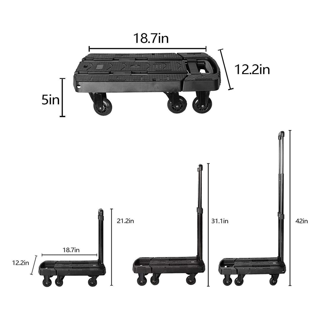 Features: LONABR Folding Luggage Cart is an excellent tool for your everyday travel, moving or office uses. Features a telescopic handle and sturdy base plate, holds up to 400 lbs,safely transport luggage, parcels. The front 4 wheels rotate 360°, ensure smooth turn and the rest 2 are locked to keep the cart stand still. Opens and closes in seconds providing easy maneuverability, easily to take around and suitable for frequent use, also fits in the trunk of a car.