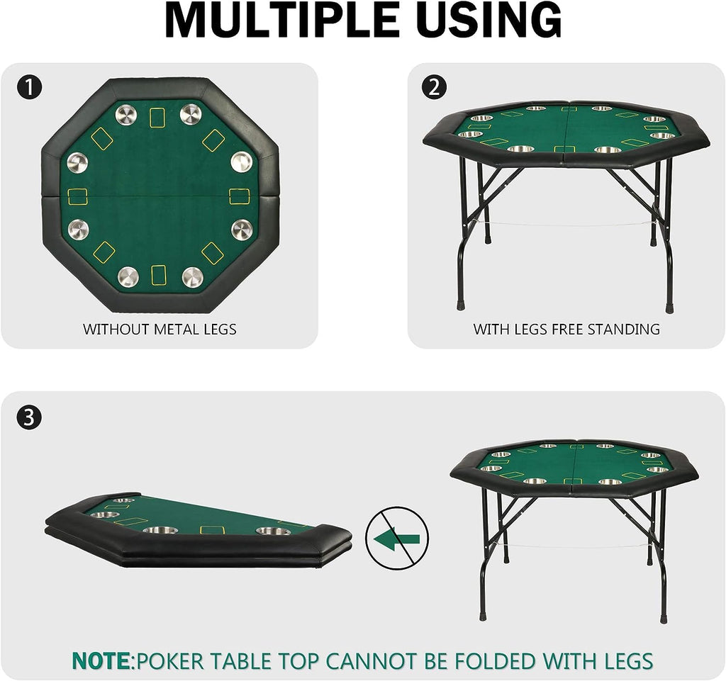 Folding Poker Table: Folding design is easy to store and move. Note: After installation, the tabletop cannot be folded in half, only the legs can be folded
