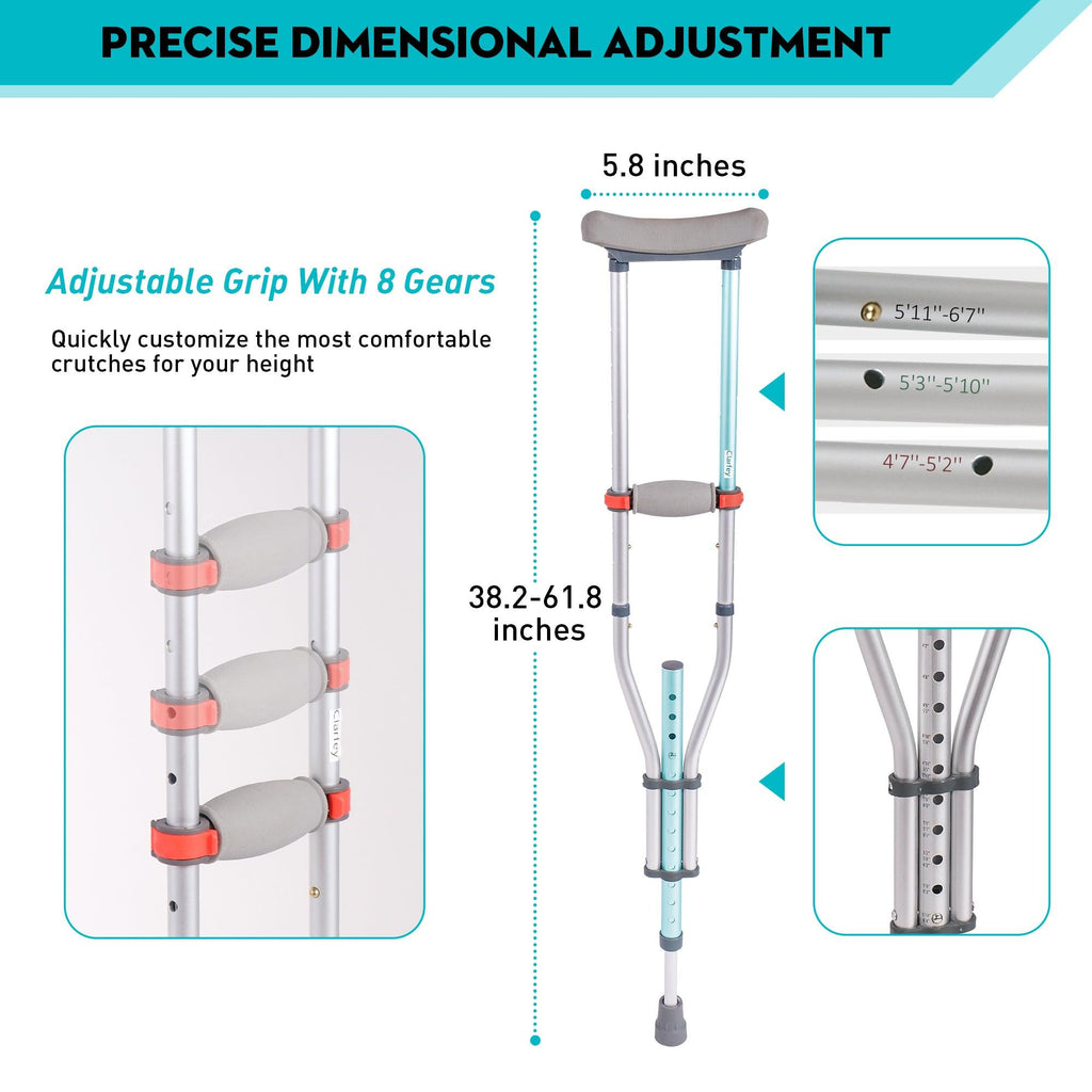 The size of the crutches can be adjusted from 38.2" to 61.8", and there are 16 adjusters in total. Allow each user to accurately adjust to the most comfortable height.