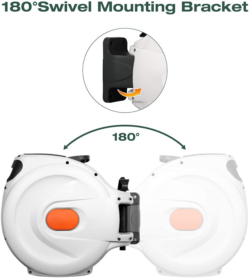 Hose Reel Wall Mount: 180 degrees swivel mounting bracket for flexible working. Just slides on and off of the mount to remove the reel easily to winterize