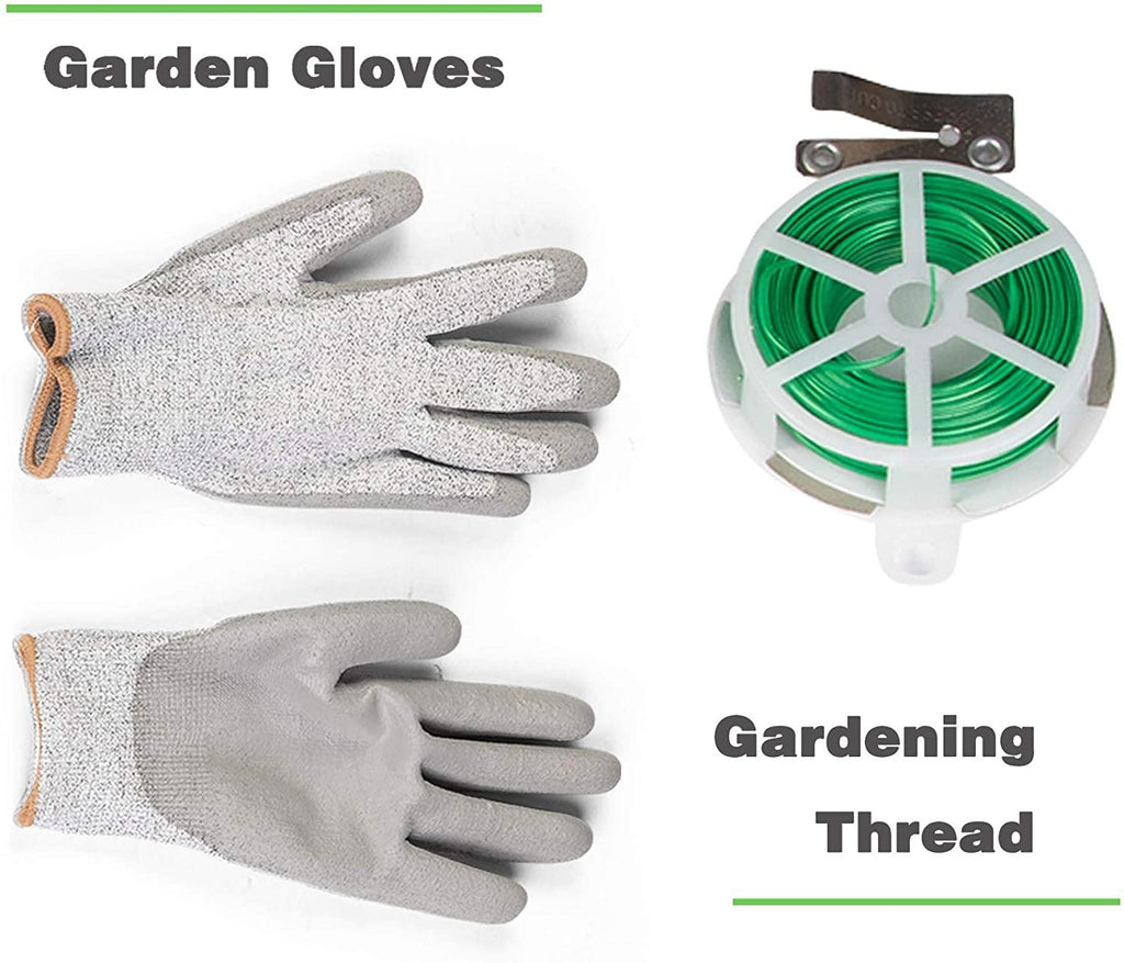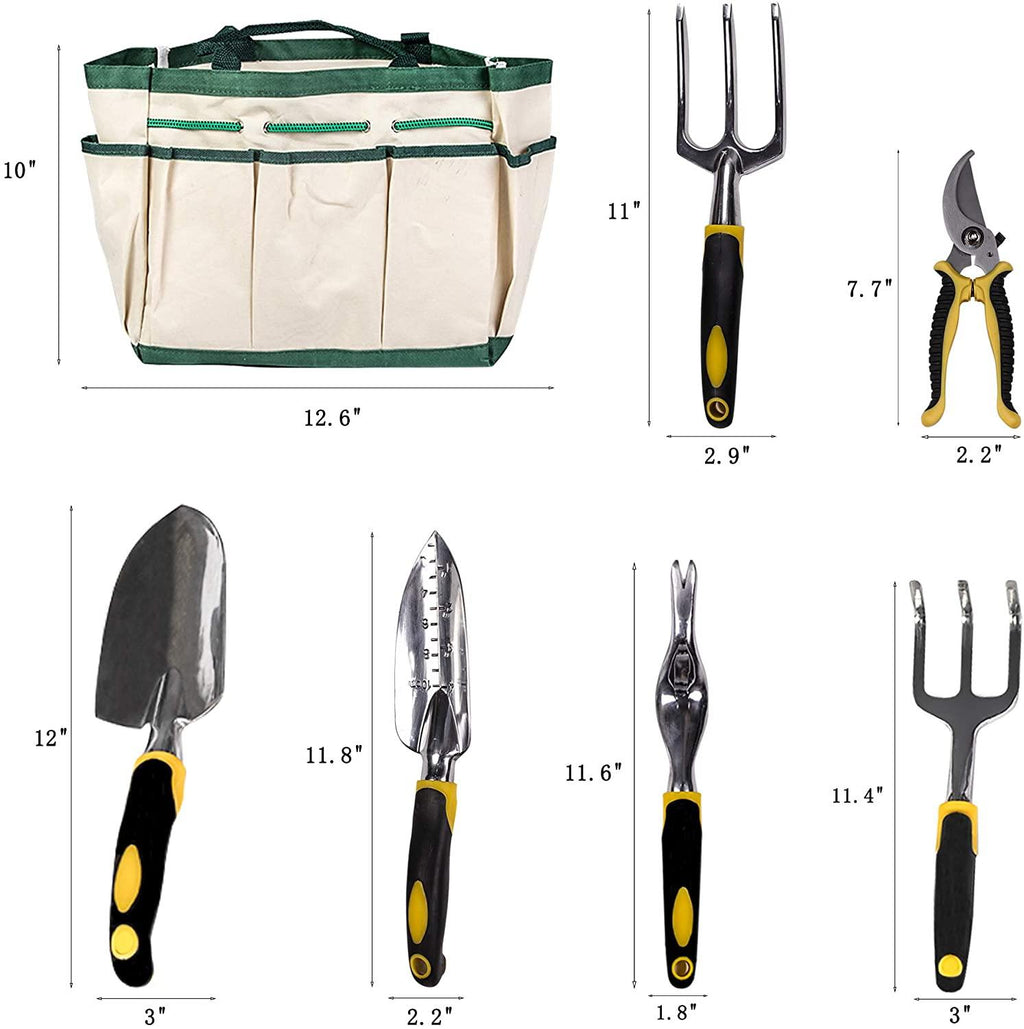 - 9 All In 1 Garden Tool Set - 9 pieces gardening kit with trowel pruner weeder transplanter rake cultivator gloves thread and lovely tote bag. Suitable for a variety of tasks including pruning, digging, weeding, loosening soil, transplanting, etc.