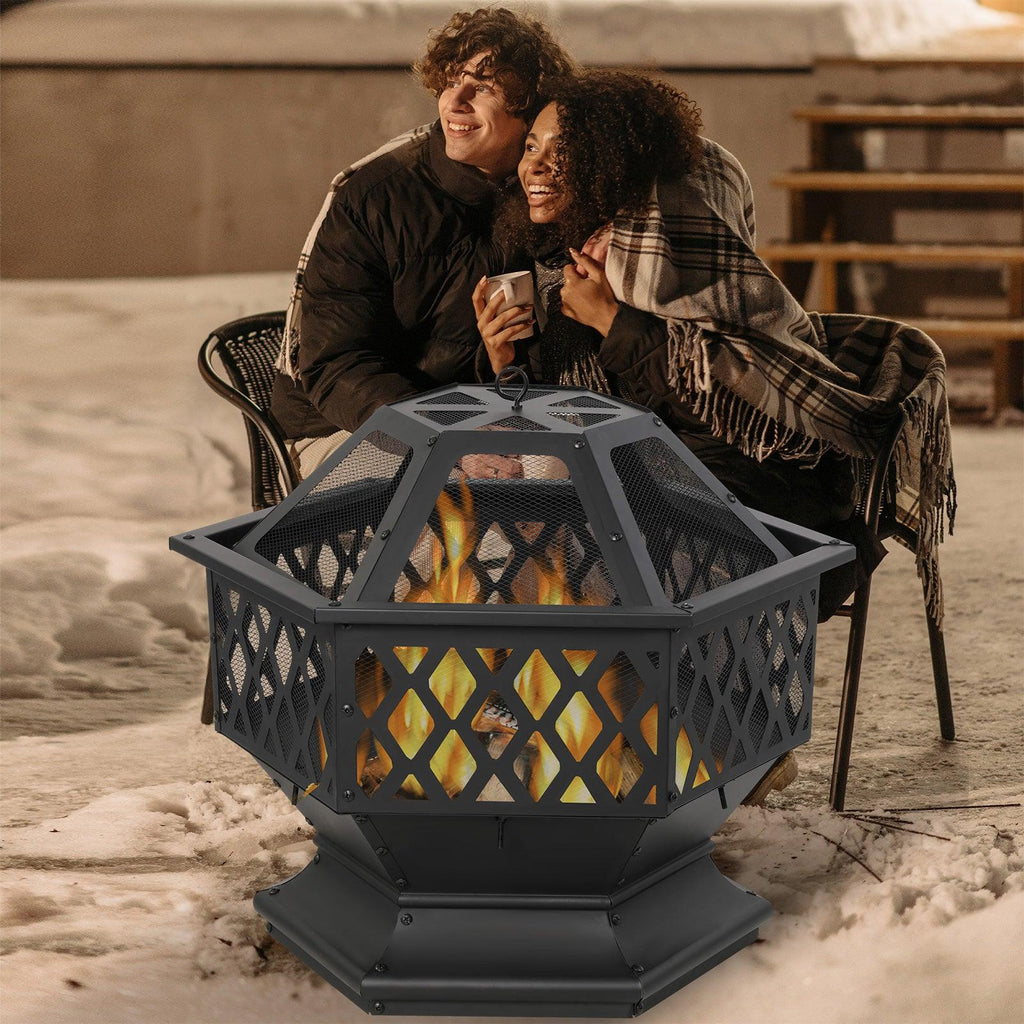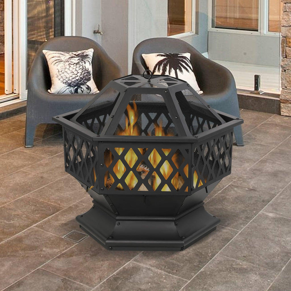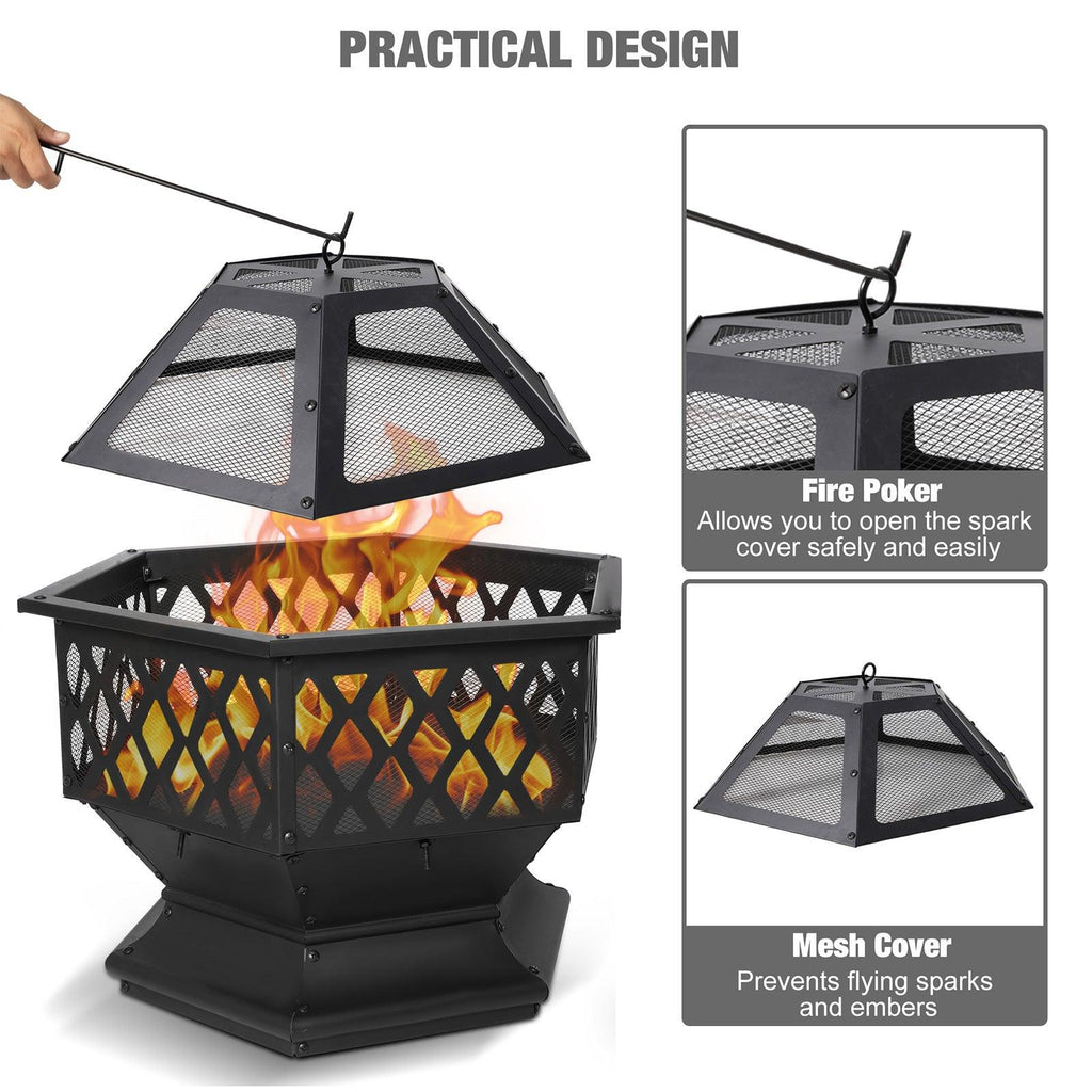 - This hexagonal fire pit is easy and safe to use, and the included grille prevents dangerous embers and sparks. It can be easily assembled and easy to clean.