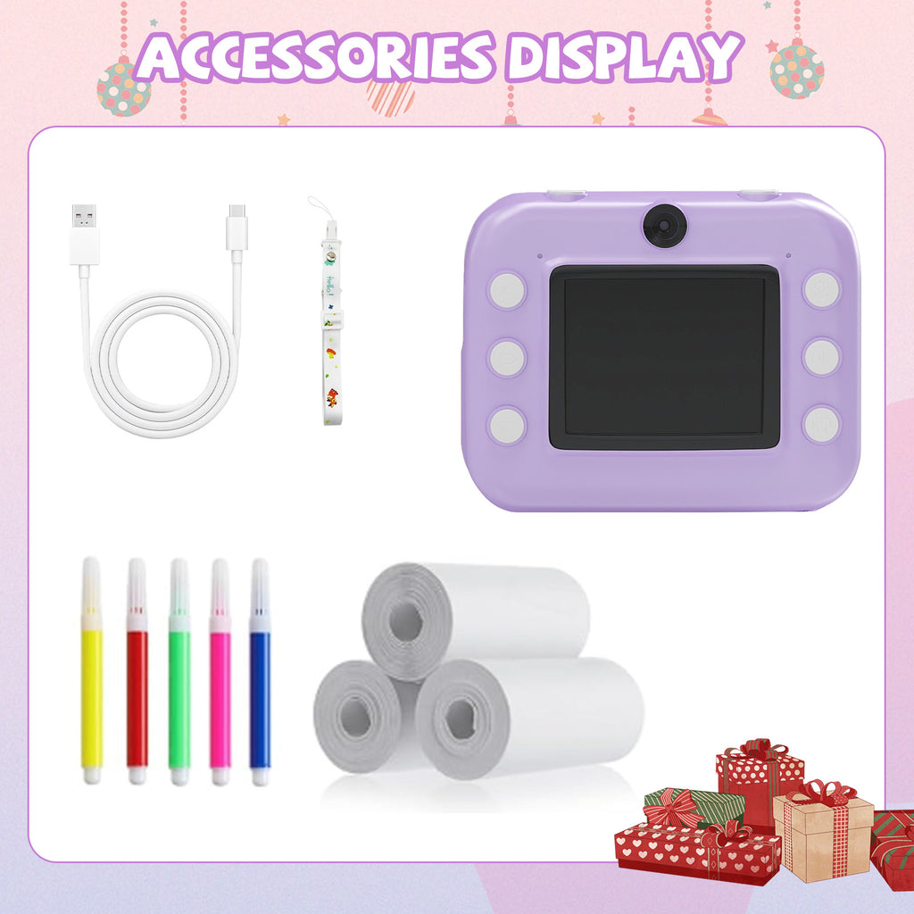 - The camera kit includes 3 rolls of printing paper and an assortment of colored pens, enabling kids to take captivating photos and add their artistic flair anywhere, anytime.