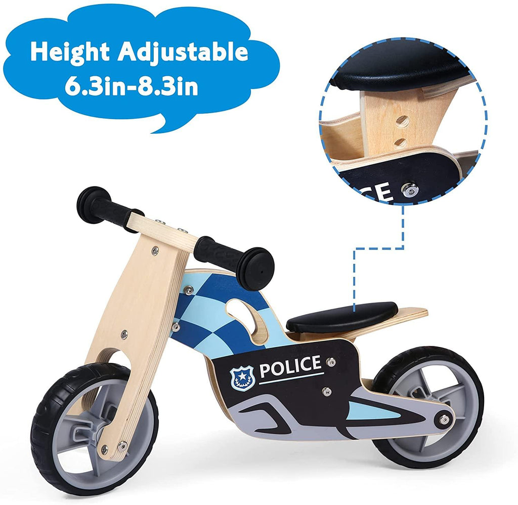 Police Car Logo, keep cute. Made of solid wood, keep sturdy. Lightweight but stable, easy to move. Adjustable seat height, meets the needs of children of different ages. Help them exercise balance, stability, coordination, stamina, assistance and patience and so on. If you are looking for such a product, don't hesitate to place an order!
