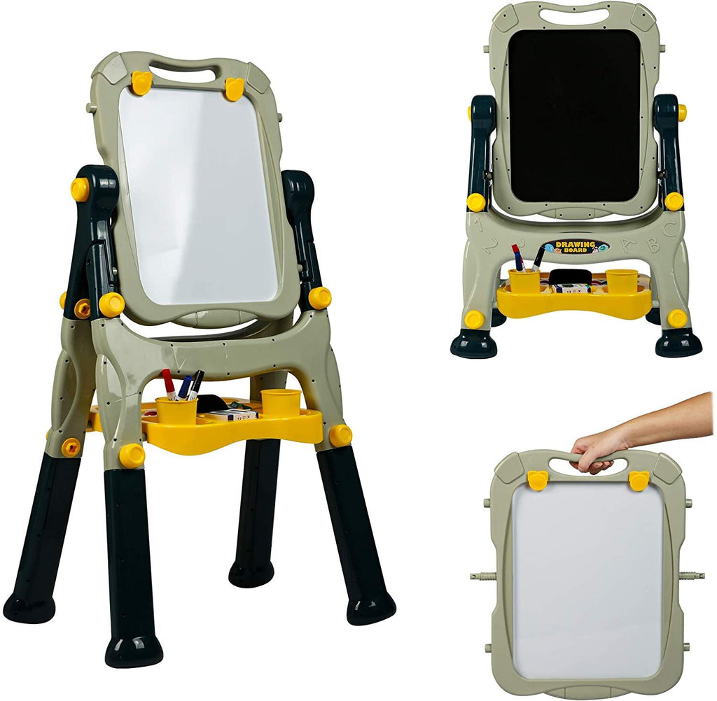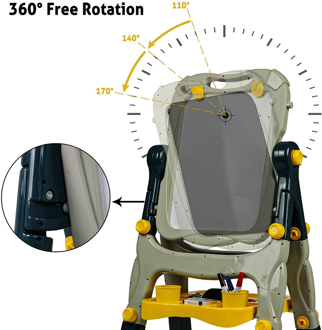 - 【Double-Sided and 360°Rotate 】This Kid's Art Easel includes two surfaces, a chalkboard on one side and magnetic dry erase board on the other, The quick flip board makes the board easy to access and painting at any angel. There is a clip on the whiteboard, you can attach the paper and draw on the paper. The two surfaces keep two or multiple kids busy and play together.