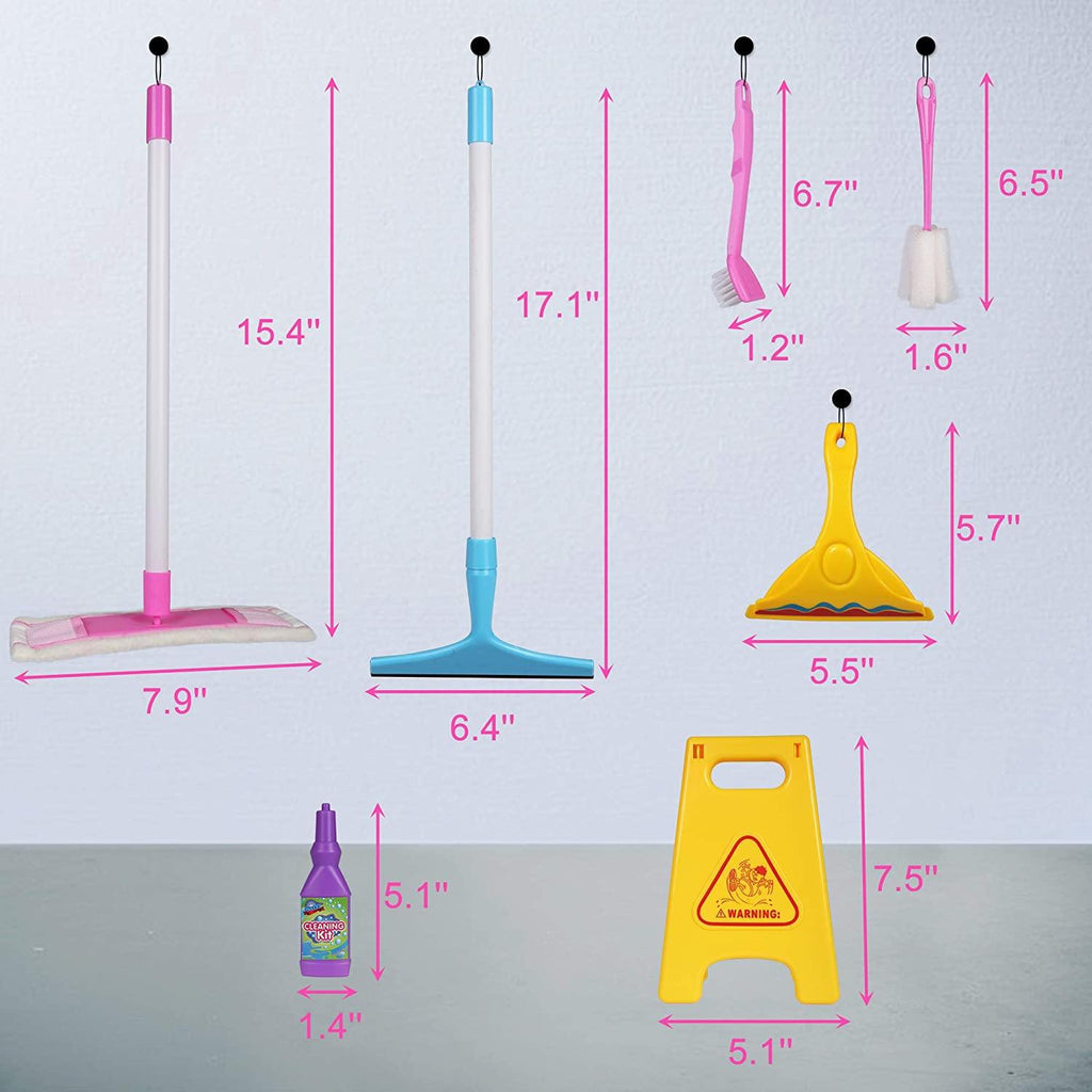7-Piece Cleaning Toys: Cleaning toy set includes 1 x Mop, 1 x Stiff Brushes , 1 x Cup brush,1 x Warning sign, 1 x Bottle, 1 x Window brush and 1 x Desktop cleaner.