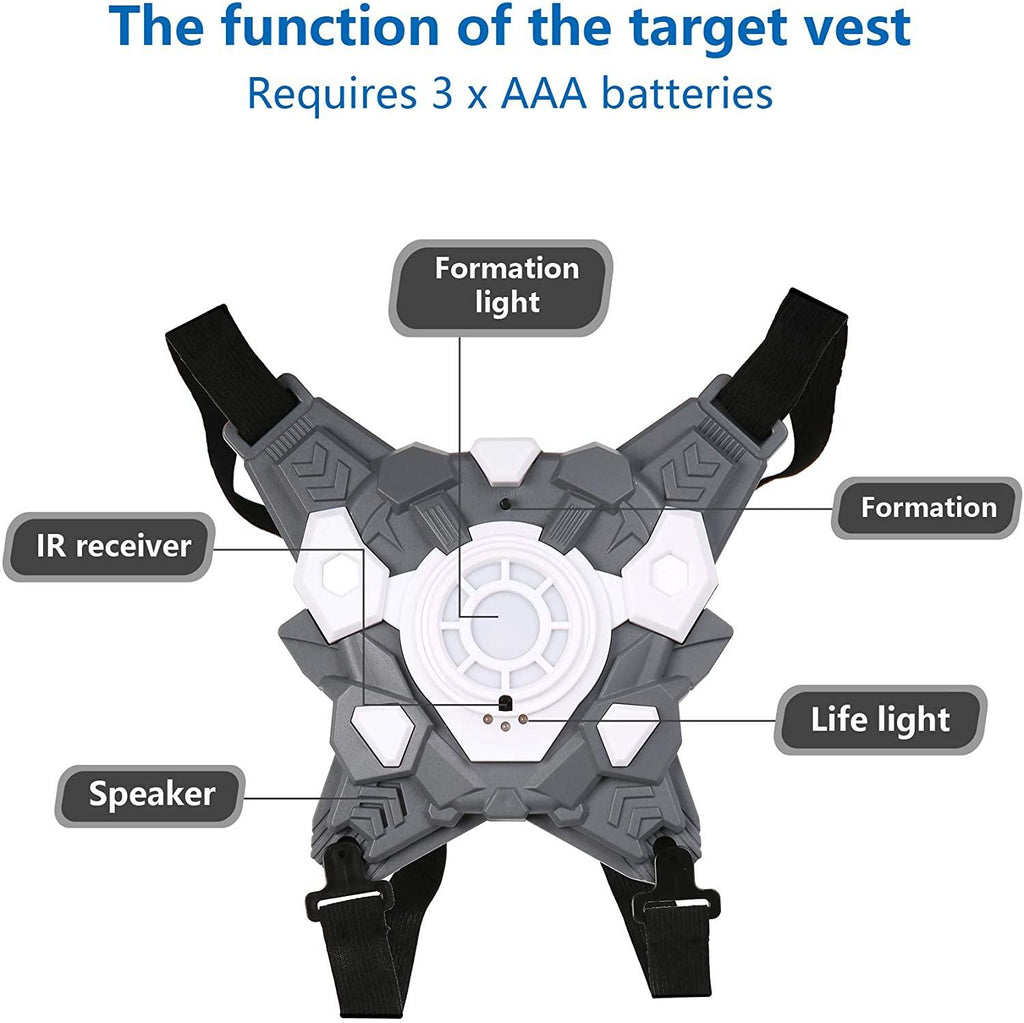 - Well made with sturdy plastic and not heavy for little kids; The gun takes 3 AAA batteries and the vest takes 3 AAA batteries as well. Gun size: 8.5in(L) x 1.5in(W) x 6in(H), Vest size: 7.3in x 6.7in.