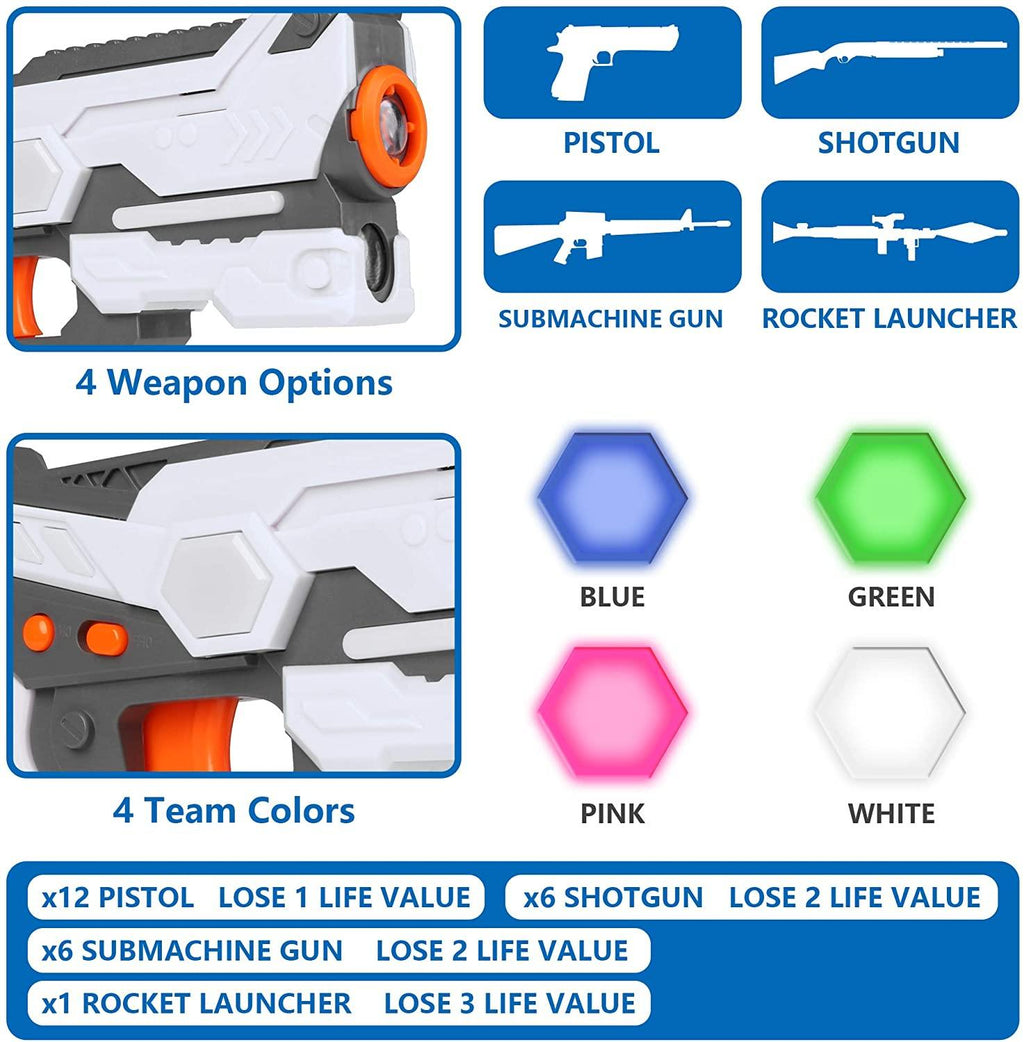 - You can switch 4 colors of team lights and 4 weapon options, and you can also decide the rules of the game, the distance is far enough for the kids run up and down in the house also at front and back yard.