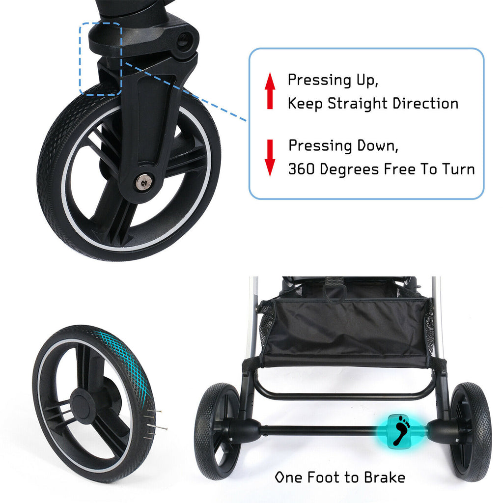 All Shock-absorbing Wheels: No matter whether you want to push it on the boardwalk, cement road, asphalt road or cobbled road, this folding baby stroller will always fit because of the shock-absorbing and anti-slip wheels. And the universal front wheels make pushing more flexible.
