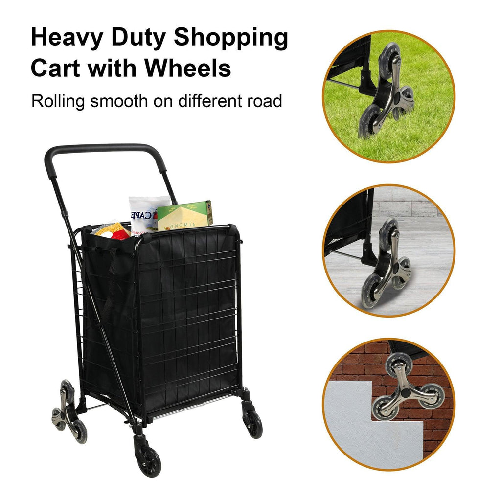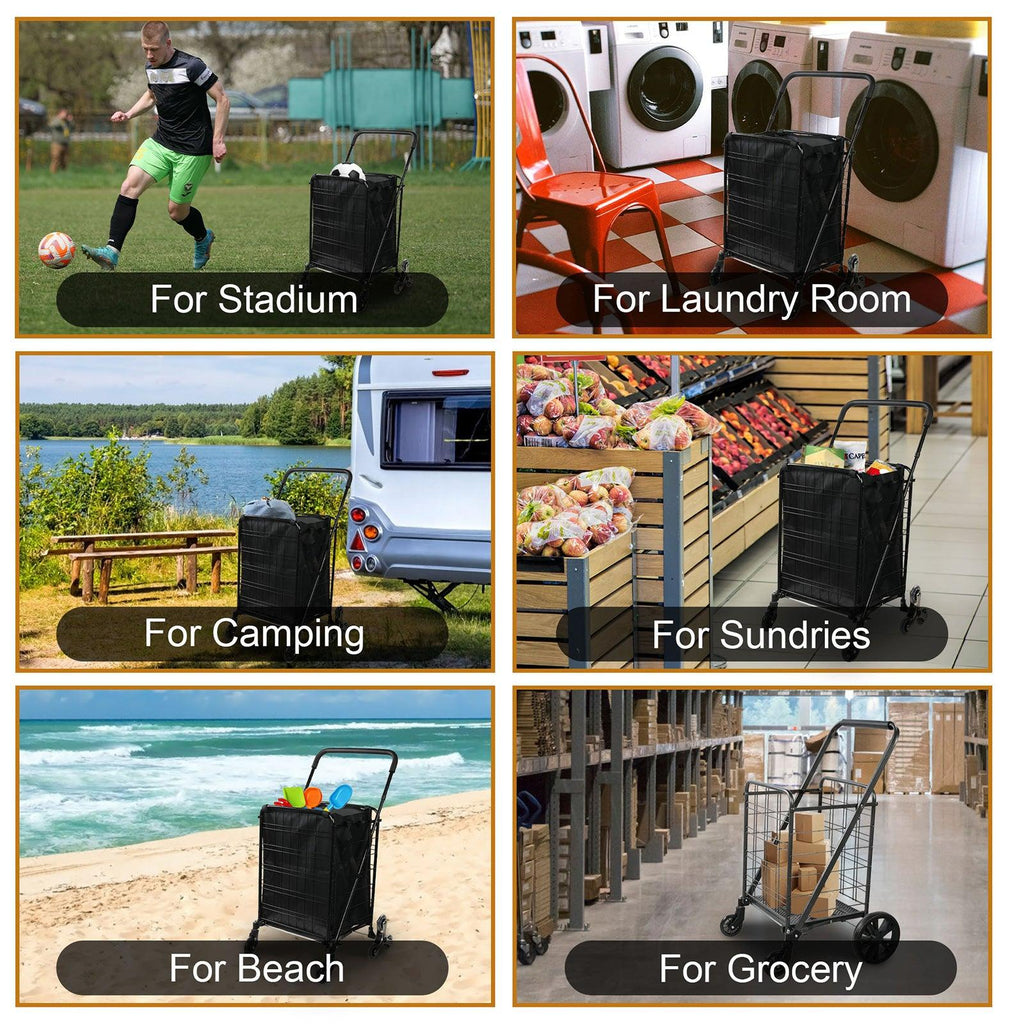Good material and performance: It is made of high-quality heavy metal, very durable and stable. Our shopping cart can accommodate a large number of items, up to 77 pounds. The front has 360 ° casters, allowing the shopping cart to smoothly turn on streets and sidewalks. The use of stainless steel crystal stair climbing wheels allows for easy rolling on most surfaces, making it effortless to lift up the stairs.