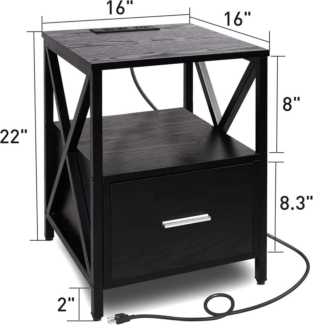 A Most Compatible Nightstand: Universal 22-inch(58cm) High Side Table Night Stand is mostly compatible to Northern American Bed Height, just reach all your belongs Freely. With side open shelf below provides you quite ample storage: 125QT; Beides Top Easy Reach Charging Station has Offered with 2 USB port and 2 NEMA 5-15 Plugs: ETL Approved with UL listed Cable & Outlet Plugs. No Extra Space Gap between Wall and Table Back.