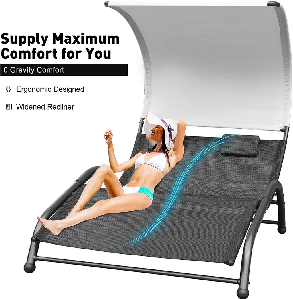 Comfortable Chaise Lounge: Our double chaise lounge is ergonomically designed with LYING POCKET, the arc-shaped seat design gives you the comfort of first class 0 gravity. The chaise lounge uses durable textilene fabric with the advantage of scratch resistance and waterproof also can offer great breathability and reduce heat transfer. Top with a detachable and washable awning made of 250-gram outdoor umbrella-grade fabric that protects you against harmful UV rays. The included two removable pillows with Velcro add extra comfort.