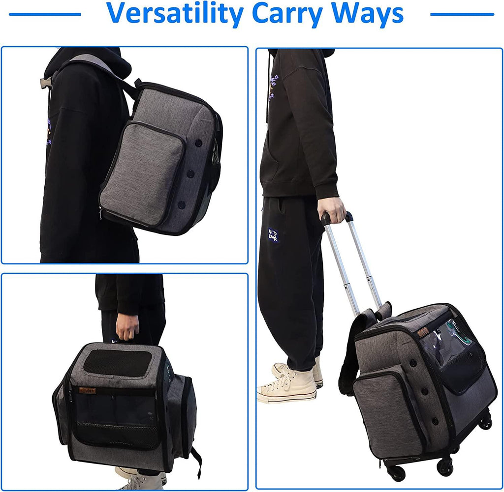 Our Bosonshop pet carrier backpack with shoulder straps (with sponge pad, does not hurt the shoulder), removable foldable wheeled luggage cart and sturdy hand-carry. The base of the wheeled luggage cart is equipped with 5 silent wheels and can be rotated 360° for more convenient movement. Suitable for shopping, picnics, medical appointments, travel , and so on.
