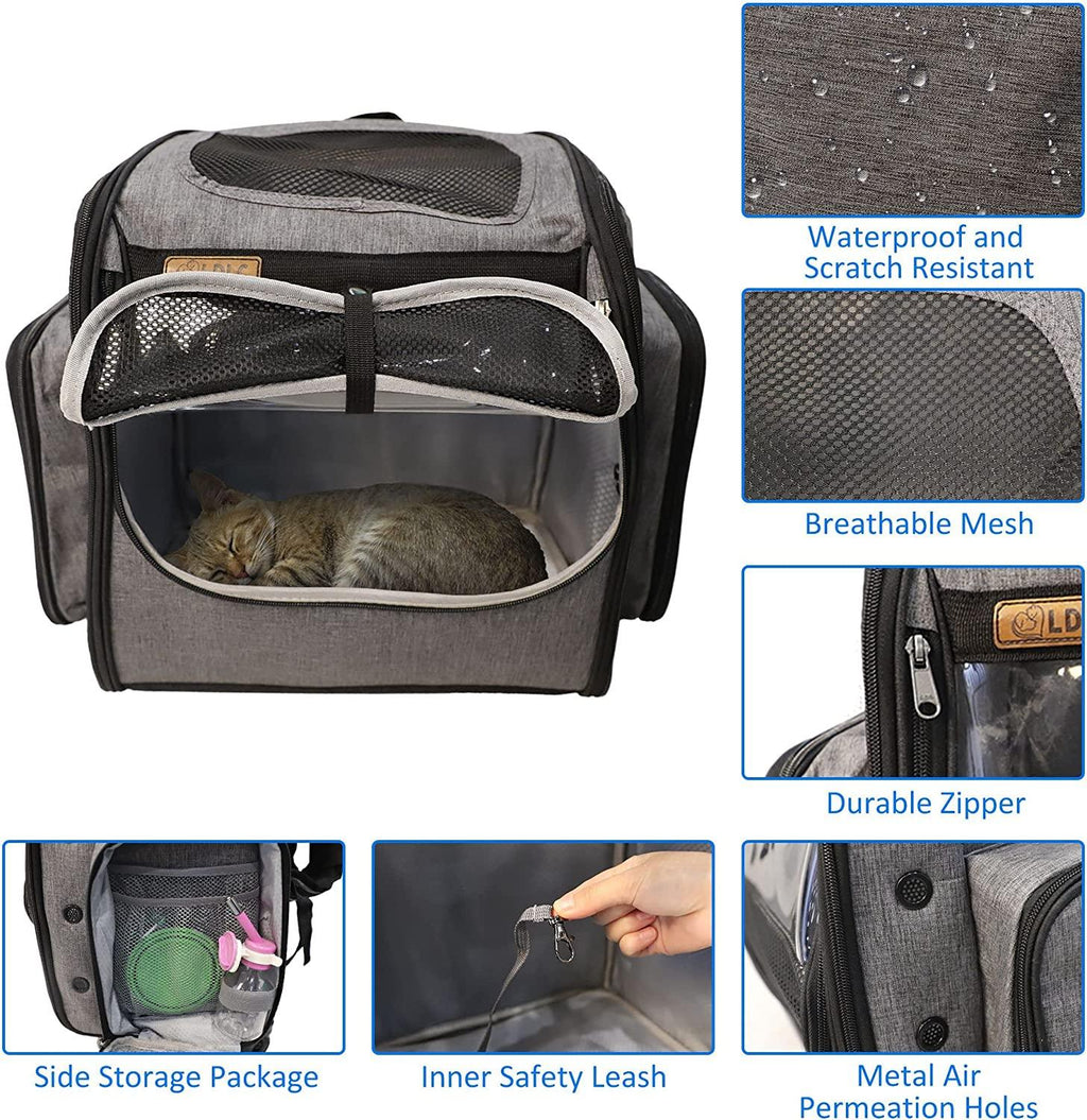Compact and Convenient Design: Both sides are equipped with pockets for your pet's essential supplies when traveling. And we give you a 3L litter box, folding litter box, folding bowl and hanging water dispenser, all of which can fit in the pocket. With metal ventilation holes on the side to provide excellent breathability for your pet. The front is transparent PVC to improve visibility and facilitate observation of your pet. Zipper design with snaps is very convenient for feeding food.