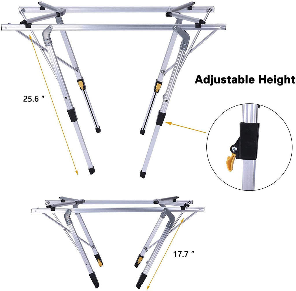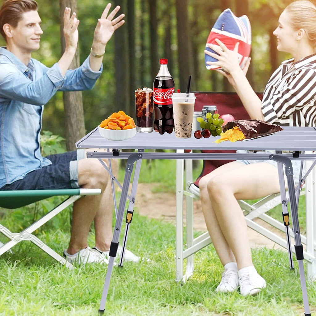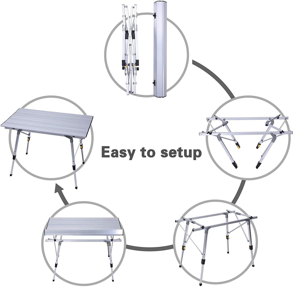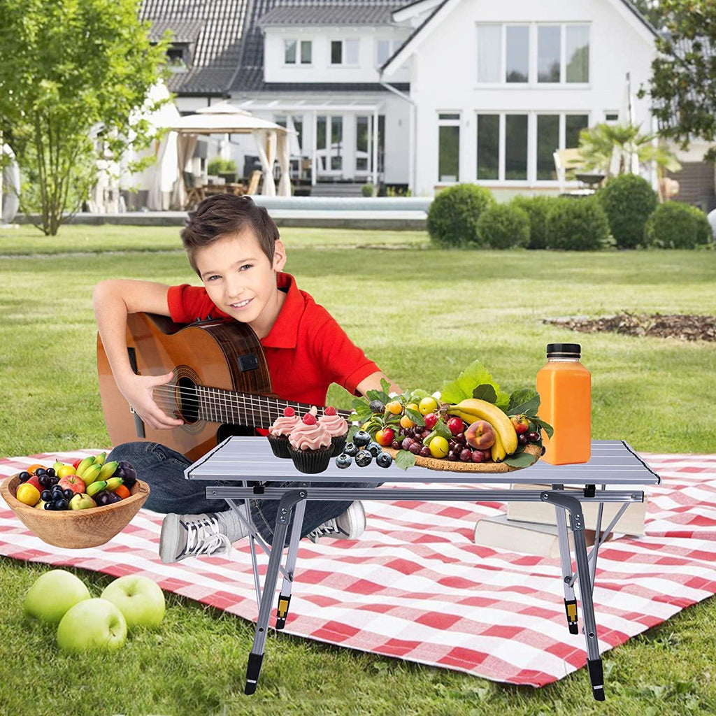 The table is portable and adjustable height, so you can use it when you are traveling, camping, hiking, fishiing. It's also suitable as a picnic, party and bed computer table. Aluminum table top and leg is fireproof, waterproof, Anti-rust, Scratch resistant, heat resistance. So it lasts longer than wooden tables and plastic tables. The table top can hold up to 50 lbs, so don't need to worry about the Stability.