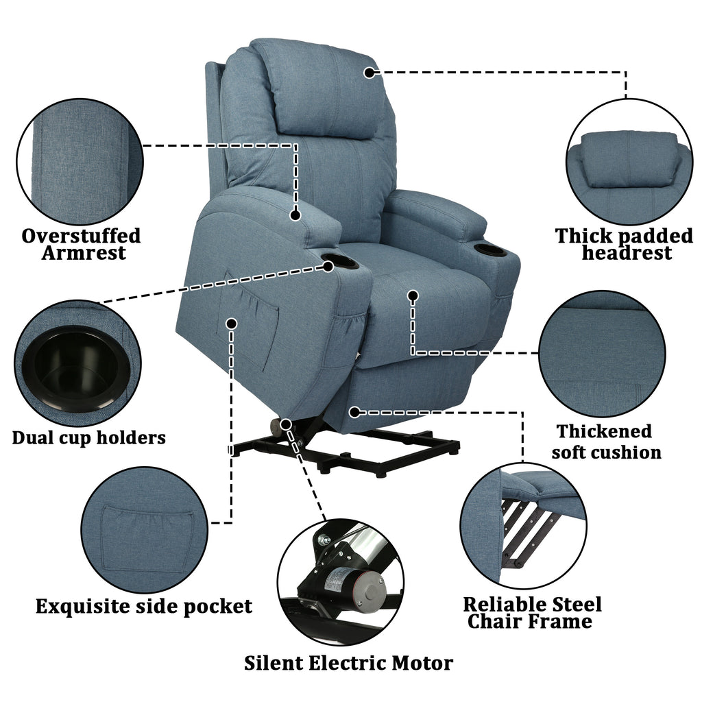 - This adjustable lift electric recliner chair comes with 4 areas of massage (shin, thigh, lumbar, head) and 5 modes (pulse, press, wave, auto, normal), meeting all your demands for different massages.