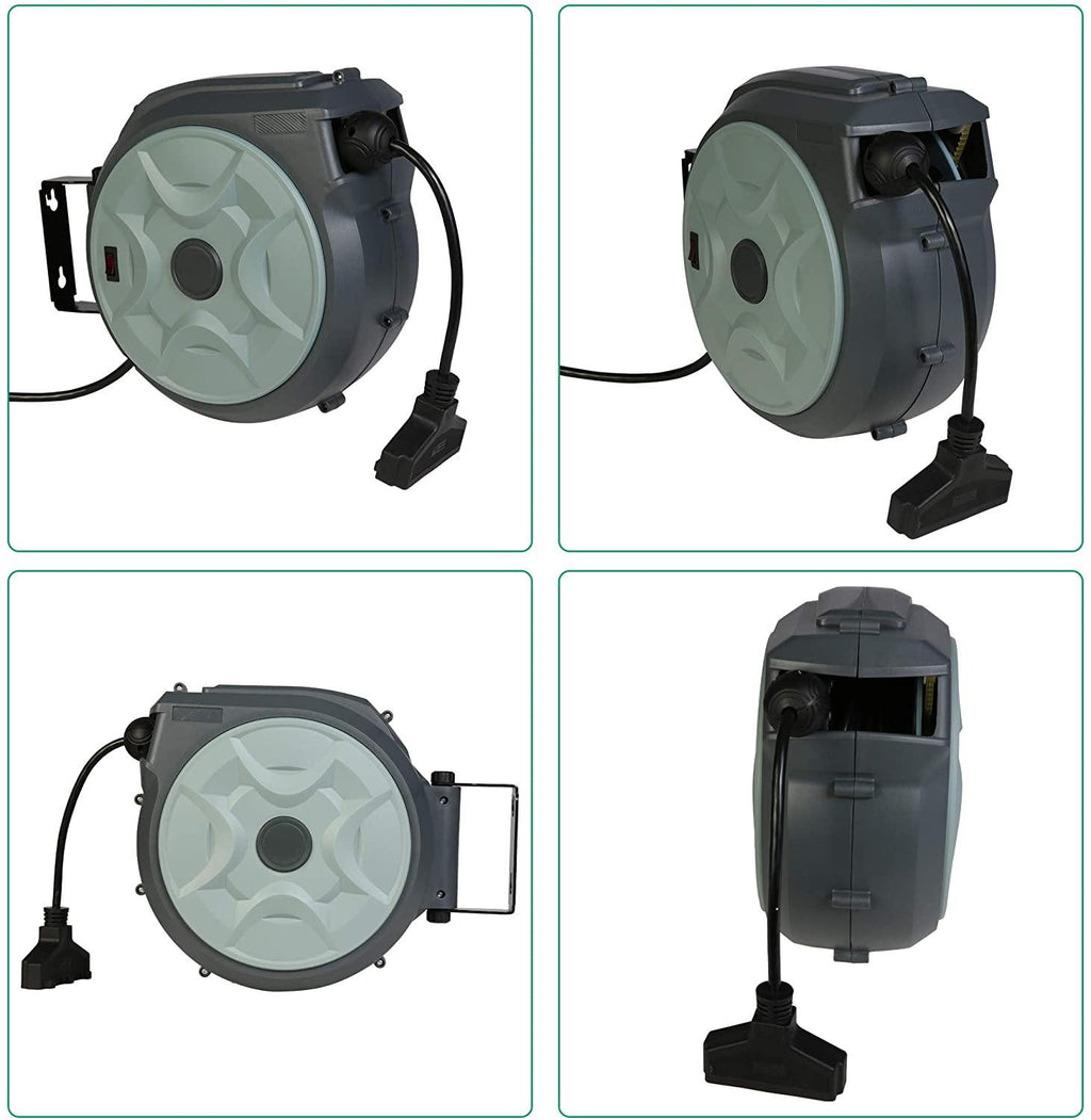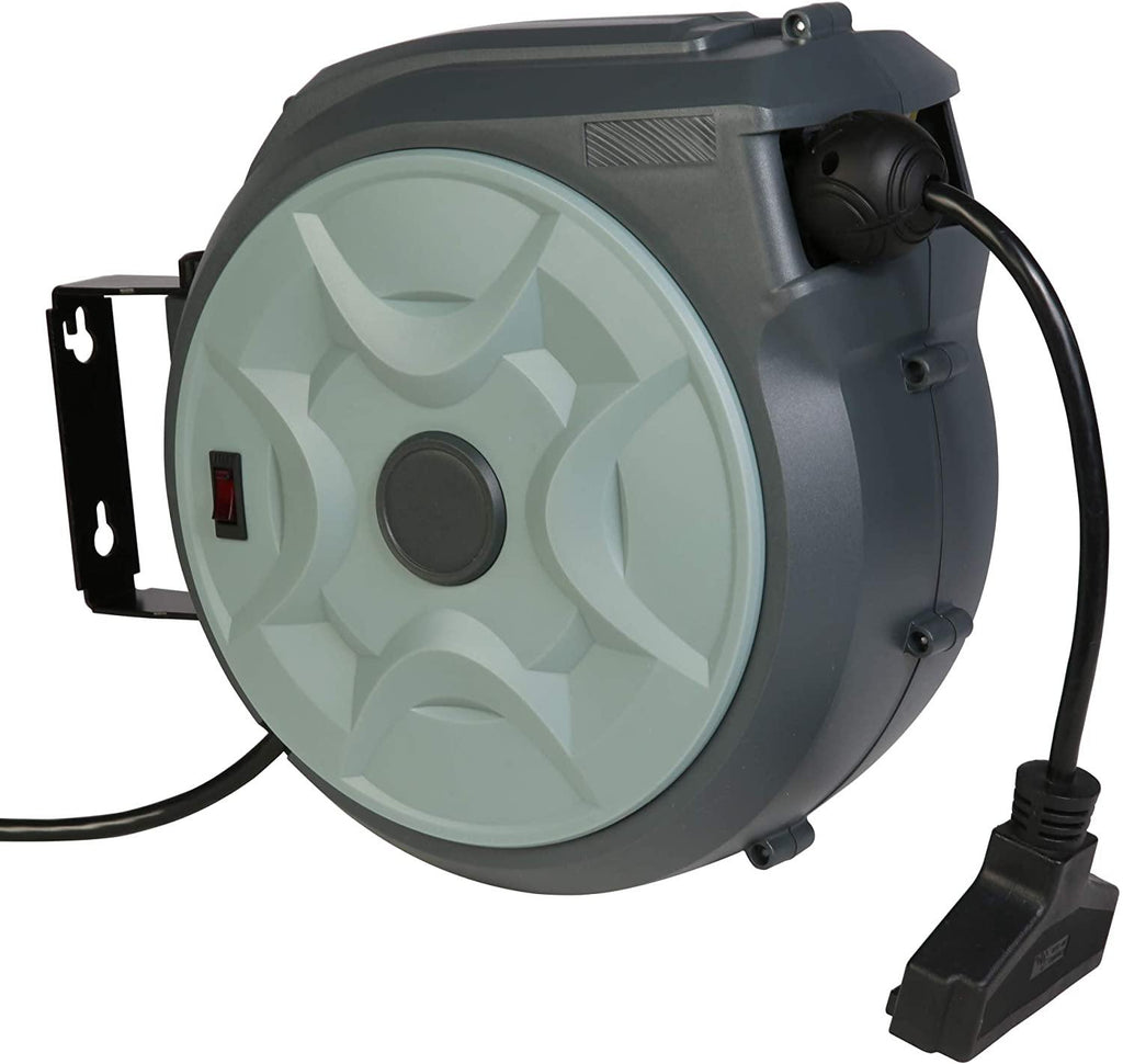 3-conductor grounded cable reel that rotates 180 degrees to maximize its use. It can be mounted on the wall or ceiling.