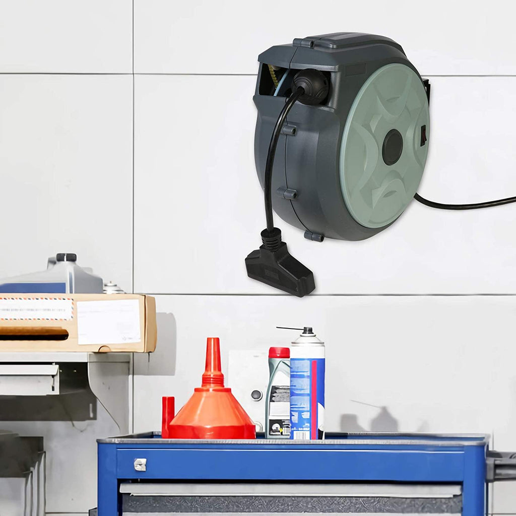 Retractable extension cord reel is 50ft + 3ft for incoming power cord. (14AWG 3C/SJT). Maximum rating 15A / 125V / 1875W 60HZ.