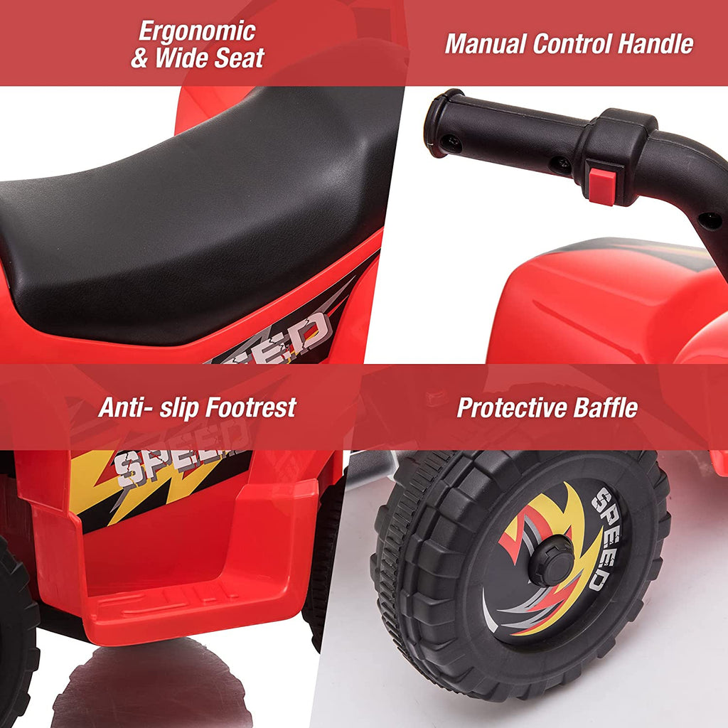 The Electric Ride on ATV is a good choice as pre-kindergarten toys for toddlers! This bright red is not only suitable for boys, but also for girls! The car with Forward/Stop/Reverse Switch, easy to operate. Mini size is not only suitable for indoor but also suitable for outdoor riding. Sturdy body and wear-resistant wheels and good battery, keep long-term use. The Electric Car can give your child a different childhood experience. Worth choosing!