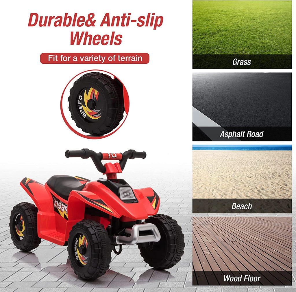 Indoor & Outdoor Ride: Equipped with 4 large anti-vibration and wear-resistant wheels, this battery powered quad allows children to stably ride on all kinds of ground. Suitable for both indoor and outdoor use. Kids can drive it on wooden floor, asphalt road and more.
