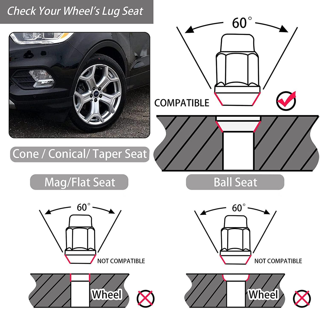 - Fitted equipment: 20 acorn lug nuts in total.Designed for 5-bolt family car. Suitable for vehicles with a 12mm*1.5mm thread pitch and a 60 degree taper base. Not suitable for factory OEM wheels and Ball/Flat/Mag seats