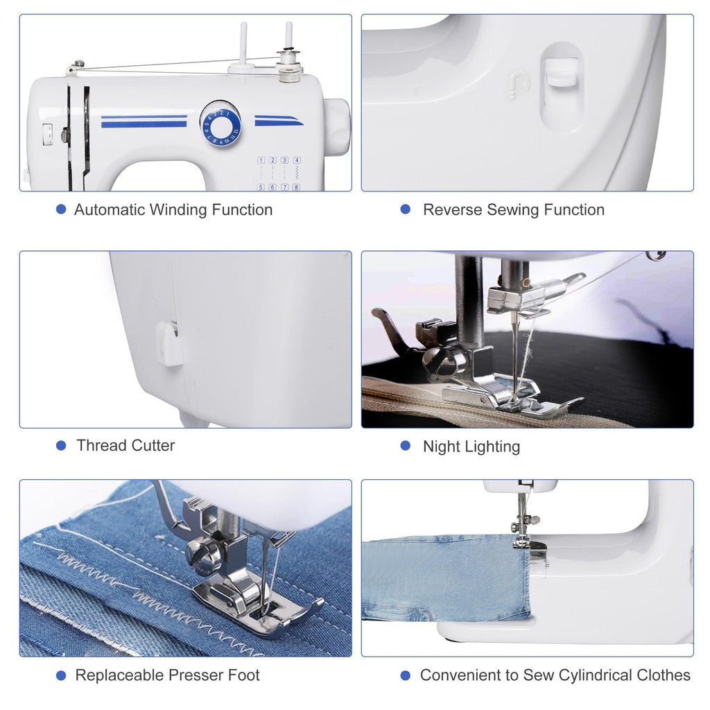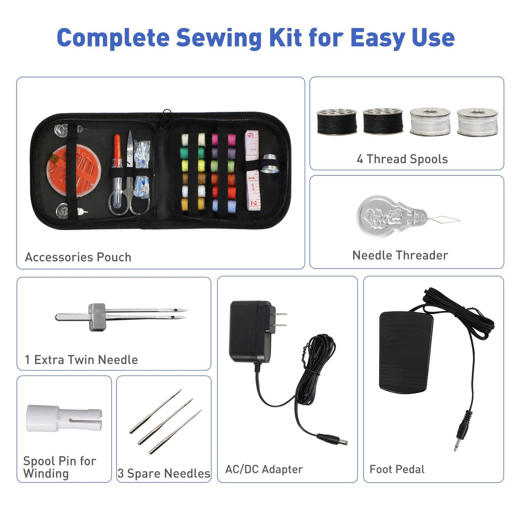 Sweing Machine Set:This sewing machine set includes a sewing machine, a needle and thread bag with various accessories, three replacement single needles, one replacement twin needle, bobbin, threader, charger, foot pedal 1 instruction manual. You can start sewing immediately after receiving the machine.