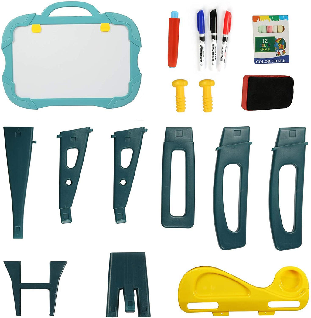 - Contain a double sided easel: 1 with a chalkboard and 1 with a dry erase white board, art supply tray, 1 easer,1 box colorful chalk(12 pcs), 1 chalk holder, 3 mark watercolor pen.