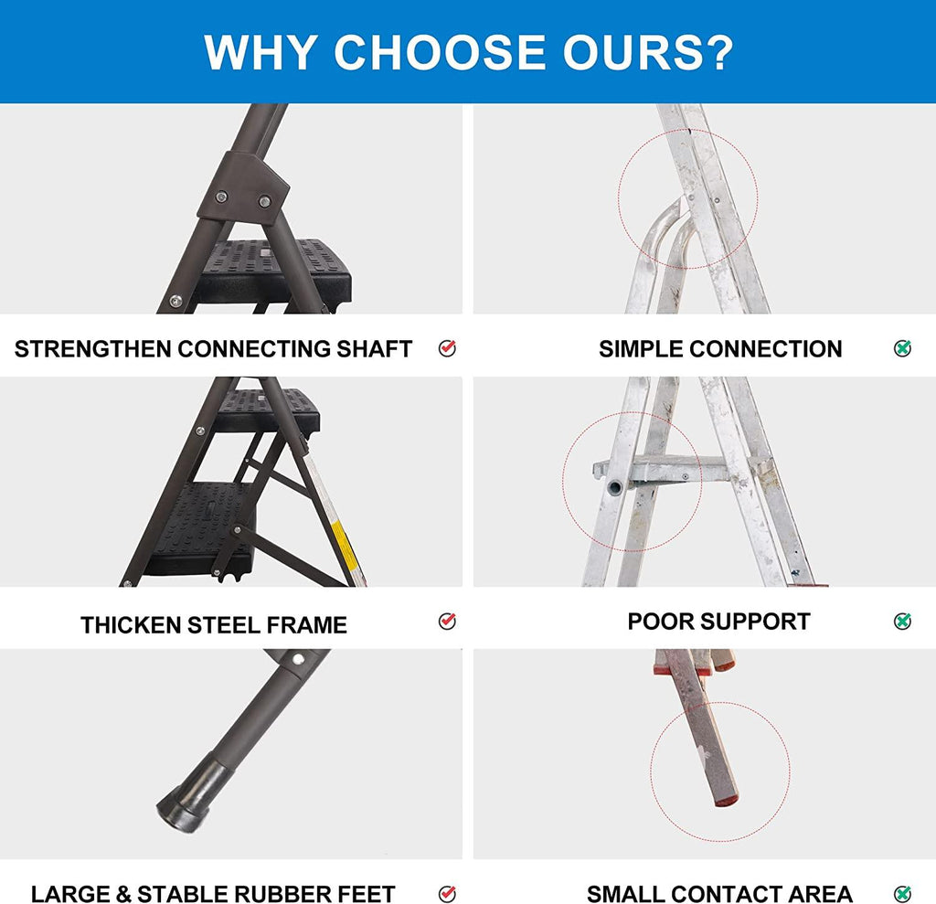 Security & Stability: Exquisite steel frame is constructed with reliability and strength. Safe buckle automatically locks in place when you use it, making the step stool stable to climb or stand.