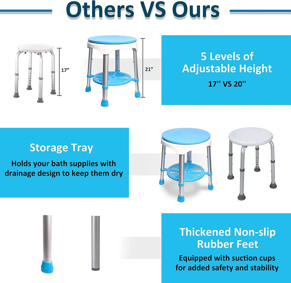 360°Rotating Shower Stool: The adjustable rotating shower seat can be rotated 360°for easy access to the bathroom. When the user/caregiver wants to turn around or go to get something, the shower stool will move with your body and easily change direction, helping to reduce leg pain when standing or sitting.