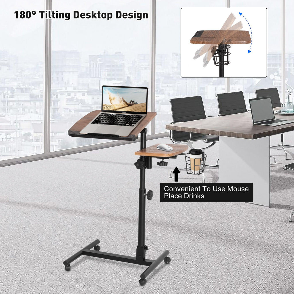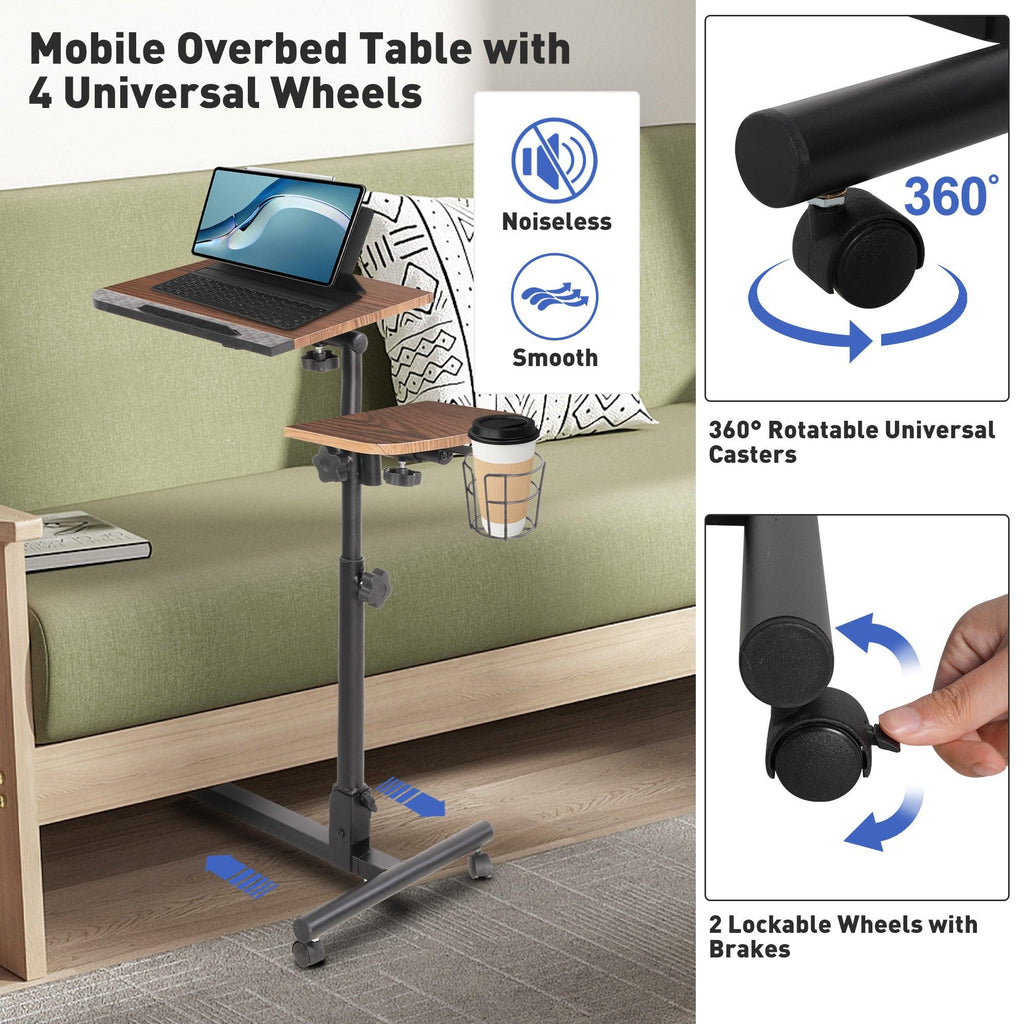 Maximize Space with our 360° Rolling Laptop Stand - Your Ergonomic Workstation Solution! Easily tilt the main panel to your desired working angle for ultimate comfort. Safety edge-stoppers ensure your belongings stay put even when the panel is tilted. Conveniently adjust the height from 23.6" to 33.1" using the dual knob system. This stand is perfect as a sofa laptop stand, over-bed hospital table, portable study table, or TV tray table for snacks and drinks.