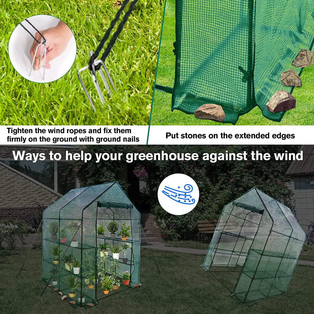 High Quality & Stable Design: The PVC cover is eco-friendly, non-toxic, corrosion-resistant, and can withstand low temperatures. The greenhouse is constructed with a metal frame that has a powder coating, and each level has a durable load-bearing net that can accommodate more seed trays, flower pots, and plant growth. 8 ground pegs and 4 ropes to make the greenhouse more stable when used outdoor.