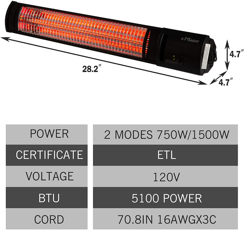 1500W power enables you to warm up in your large garage efficiently during cold winter. Ideal for HOME USE OR COMMERCIAL USE, gazebos, patios, outdoor cafes, restaurants, garages, balconies, workshops, and any other indoor or outdoor living space. No Noise Heater. Outdoor patio heater producing no odors, chemicals, or fumes.