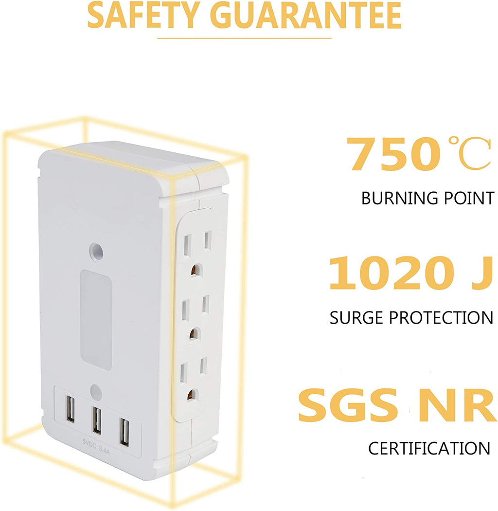 - Wall Outlet Extender: This multifunctional wall plug has 6 AC outlets (15 A)with 1020J surge protector wall mount, 3 USB ports(5V/3.4A total), surge protection indicator light, suitable for all types of standard electrical outlets.