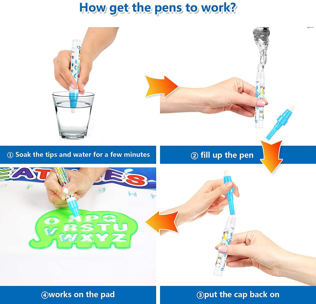 - Set up is quick and easy, just soak the tip and fill the pens with water. You don’t need worried about kids biting on the pen tip or drawing on their clothes since it’s just water. Also no mess whatsoever.