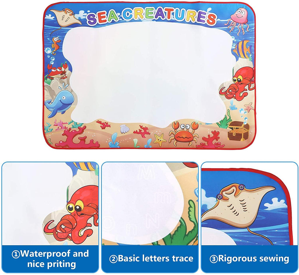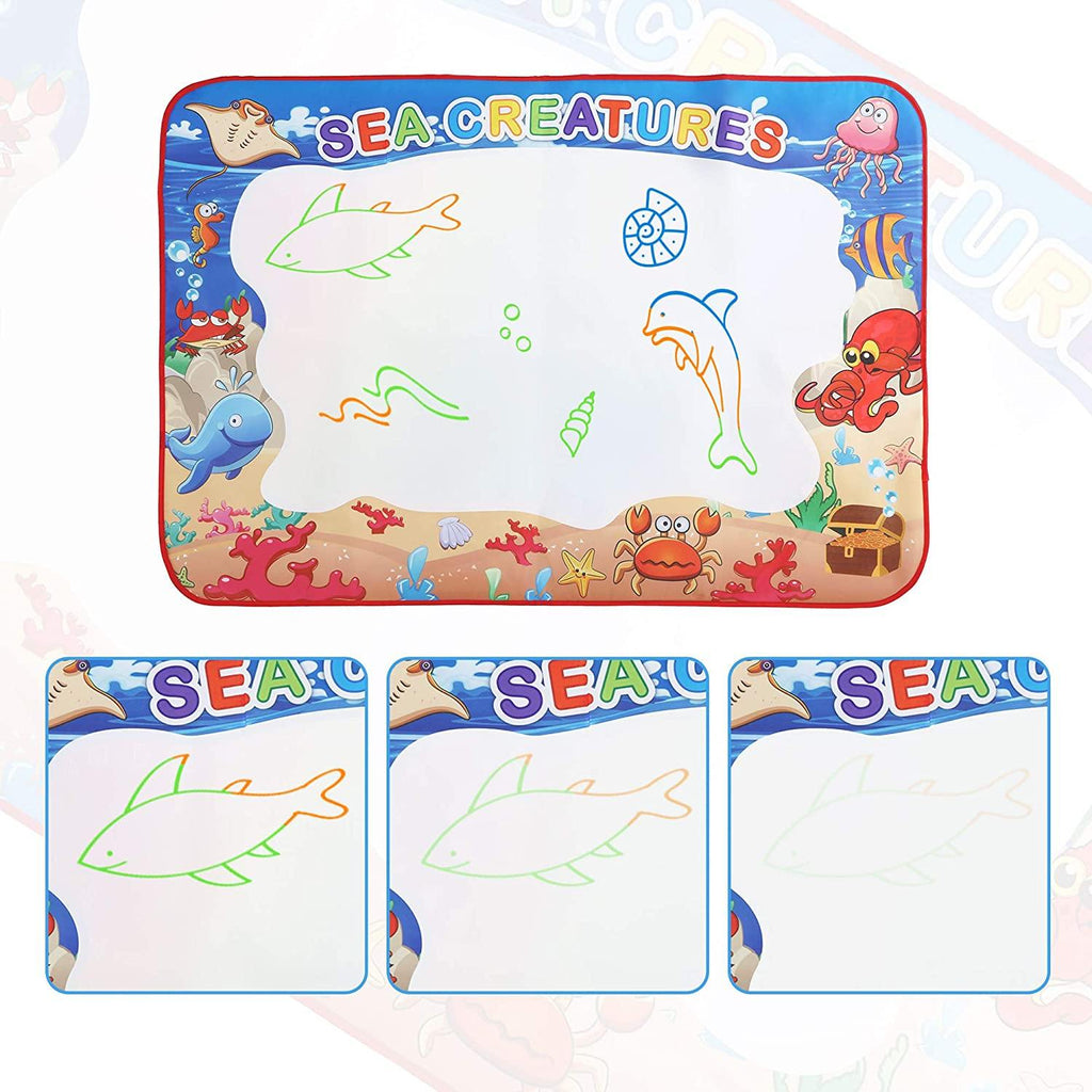 Water doodle mat provided a water based pen that allowed kids to draw and doodle without the headache of accidentally drawing onto all parts of the house. It does have a waterproof back on it, so it prevents leakage on the other side. It keeps kids entertained for at least an hr at a time which is critical during these times of stay at home order. There are so many great stencils that the product includes. No clean up required. No mess fun for all ages. If you are looking for something to keep your keeps occupied while letting their creativity flow, this mat is your best choice.