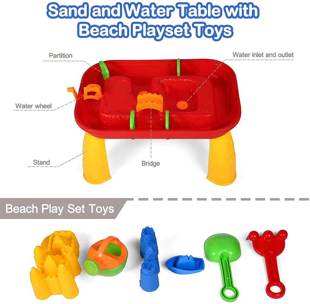 - Kids can use partitions to block water and sand, or they can manually shake the water wheel to make the water splash, also they can use molds to press vivid castles, or use a rake and spoon to play in the sand. This sand and water table for kids can help your child develop their hand-eye coordination, motor skills.